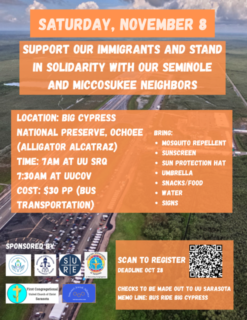 Finally, I invite all our readers to join us on Saturday, November 8, 2025, for a trip to Big Cypress Detention Center. We will depart from the Unitarian Universalist Church of Sarasota at 7:00 a.m., with a stop at UU of Venice at 7:30 a.m., returning by 3:00 p.m. The cost is $30 per person.